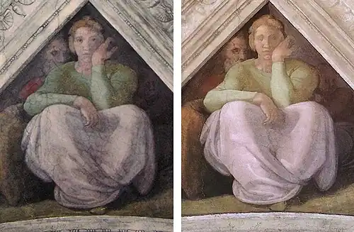 There are still intense areas of shadow which throw the Cumaean Sibyl into relief. But it is more than relief; it is the three-dimensionality which art-lovers expect to see in the work of the man who sculpted Moses.[22] Critics of the restoration claim that this was Michelangelo's aim and that many frescoes had brightly contrasting colours laid side-by-side that were then worked over a secco to achieve this effect and that this is what has been lost by a too-scrupulous cleaning.[21]