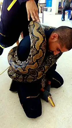 The huge size and attractive pattern of this snake has made it a favorite zoo exhibit, with several individuals claimed to be above 20 ft (6.1 m) in length and more than one claimed to be the largest in captivity.[33] However, due to its huge size, immense strength, aggressive disposition, and the mobility of the skin relative to the body, it is very difficult to get exact length measurements of a living reticulated python, and weights are rarely indicative, as captive pythons are often obese.[27] Claims made by zoos and animal parks are sometimes exaggerated, such as the claimed 14.85 m (48 ft 9 in) snake in Indonesia which was subsequently proven to be about 6.5–7 m (21 ft 4 in – 23 ft 0 in) long.[34] For this reason, scientists do not accept the validity of length measurements unless performed on a dead or anesthetized snake that is later preserved in a museum collection or stored for scientific research.[27]