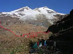 Methods for measuring retreat include staking terminus location, global positioning mapping, aerial mapping and laser altimetry.[16][18] The key symptom of disequilibrium is thinning along the entire length of the glacier. This indicates a diminishment of the accumulation zone. The result is marginal recession of the accumulation zone margin, not just of the terminus. In effect, the glacier no longer has a consistent accumulation zone and without an accumulation zone cannot survive.[17][19] On Mount Stanley, an exhibition team sent out by Project Pressure created the first ever 3D model of the glacier using drone photography and GNSS technology showing a surface area decline of 29.5% between 2020 and 2024[20].