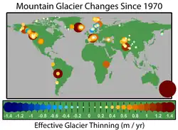 The mass balance, or difference between accumulation and ablation (melting and sublimation), of a glacier is crucial to its survival.[14] Climate change may cause variations in both temperature and snowfall, resulting in changes in mass balance. A glacier with a sustained negative balance loses equilibrium and retreats. A sustained positive balance is also out of equilibrium and will advance to reestablish equilibrium. Currently, nearly all glaciers have a negative mass balance and are retreating.[15]