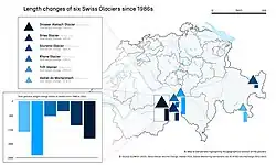 Six Swiss glaciers' length change from 1986 to 2022.[44]