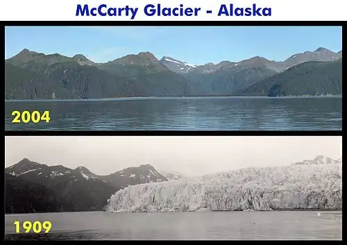 Alaska's McCarty Glacier retreated about 15 kilometres (9.3 mi) in less than a century, and dense, diverse vegetation has become established on the slopes.[1]