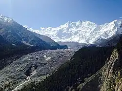 In the Wakhan Corridor of Afghanistan 28 of 30 glaciers examined retreated significantly between 1976 and 2003, with an average retreat of 11 m (36 ft) per year.[77] One of these glaciers, the Zemestan Glacier, retreated 460 m (1,510 ft) during this period, not quite 10% of its 5.2 km (3.2 mi) length.[78] In examining 612 glaciers in China between 1950 and 1970, 53% of the glaciers studied were retreating. After 1990, 95% of these glaciers were measured to be retreating, indicating that retreat of these glaciers was becoming more widespread.[79] Glaciers in the Mount Everest region of the Himalayas are all in a state of retreat. The Rongbuk Glacier, draining the north side of Mount Everest into Tibet, has been retreating 20 m (66 ft) per year. In the Khumbu region of Nepal along the front of the main Himalaya of 15 glaciers examined from 1976 to 2007 all retreated significantly and the average retreat was 28 m (92 ft) per year.[80] The most famous of these, the Khumbu Glacier, retreated at a rate of 18 m (59 ft) per year from 1976 to 2007.[80] In India, the Gangotri Glacier retreated 1,147 m (3,763 ft) between 1936 and 1996 with 850 m (2,790 ft) of that retreat occurring in the last 25 years of the 20th century.[81][82] However, the glacier is still over 30 km (19 mi) long.[82] In Sikkim, 26 glaciers examined between 1976 and 2005 were retreating at an average rate of 13.02 m (42.7 ft) per year.[83] Overall, glaciers in the Greater Himalayan region that have been studied are retreating an average of between 18 and 20 m (59 and 66 ft) annually.[84] The only region in the Greater Himalaya that has seen glacial advances is in the Karakoram Range and only in the highest elevation glaciers, but this has been attributed possibly increased precipitation as well as to the correlating glacial surges, where the glacier tongue advances due to pressure build up from snow and ice accumulation further up the glacier. Between 1997 and 2001, 68 km (42 mi) long Biafo Glacier thickened 10 to 25 m (33 to 82 ft) mid-glacier, however it did not advance.[85]