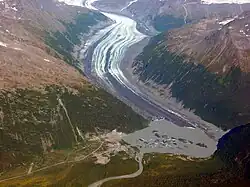 Valdez Glacier has thinned 90 m (300 ft) over the last century, exposing barren ground near the glacial margins.[37]