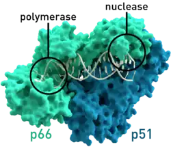 - ^ a b Sarafianos SG, Marchand B, Das K, Himmel DM, Parniak MA, Hughes SH, Arnold E (January 2009). "Structure and function of HIV-1 reverse transcriptase: molecular mechanisms of polymerization and inhibition". Journal of Molecular Biology. 385 (3): 693–713. doi:10.1016/j.jmb.2008.10.071. PMC 2881421. PMID 19022262.