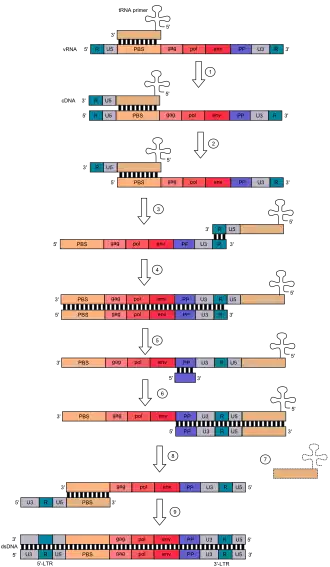 Retroviral RNA is arranged in 5′ terminus to 3′ terminus. The site where the primer is annealed to viral RNA is called the primer-binding site (PBS). The RNA 5′end to the PBS site is called U5, and the RNA 3′ end to the PBS is called the leader. The tRNA primer is unwound between 14 and 22 nucleotides and forms a base-paired duplex with the viral RNA at PBS. The fact that the PBS is located near the 5′ terminus of viral RNA is unusual because reverse transcriptase synthesize DNA from 3′ end of the primer in the 5′ to 3′ direction (with respect to the newly synthesized DNA strand). Therefore, the primer and reverse transcriptase must be relocated to 3′ end of viral RNA. In order to accomplish this reposition, multiple steps and various enzymes including DNA polymerase, ribonuclease H(RNase H) and polynucleotide unwinding are needed.[12][13]