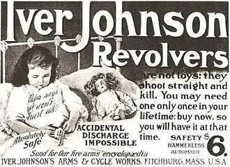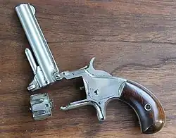 The first top-break revolver was patented in France and Britain at the end of December in 1858 by Devisme.[57] The most commonly found top-break revolvers were manufactured by Smith & Wesson, Webley & Scott, Iver Johnson, Harrington & Richardson, Manhattan Fire Arms, Meriden Arms, and Forehand & Wadsworth.[58]