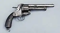 In 1854, Eugene Lefaucheux introduced the Lefaucheux Model 1854, the first revolver to use self-contained metallic cartridges rather than loose powder, pistol ball, and percussion caps. It is a single-action, pinfire revolver holding six rounds.[24]