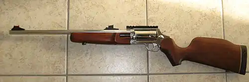 Most modern revolvers are "traditional double-action", which means they may operate either in single-action or self-cocking mode. The accepted meaning of "double-action" has come to be the same as "self-cocking", so modern revolvers that cannot be pre-cocked are called "double-action-only".[40] These are intended for concealed carry, because the hammer of a traditional design is prone to snagging on clothes when drawn. Most revolvers do not come with accessory rails, which are used for mounting lights and lasers, except for the Smith & Wesson M&P R8 (.357 Magnum),[41] Smith & Wesson Model 325 Thunder Ranch (.45 ACP),[42] and all versions of the Chiappa Rhino (.357 Magnum, 9×19mm, .40 S&W, or 9×21mm) except for the 2" and 3" models, respectively.[43] However, certain revolvers, such as the Taurus Judge and Charter Arms revolvers, can be fitted with accessory rails.[44]