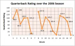 During the 2006 season, Grossman became the first Bears quarterback to start all sixteen games since Erik Kramer in 1995.[34] In a season dubbed as a "roller coaster ride" by Grossman himself, the fourth-year quarterback had several productive performances, which were seemingly diluted by a handful of turnover-ridden games, especially in Week 6 against the Arizona Cardinals, where Grossman fumbled twice and threw four interceptions.[35] While earning a passer rating of at least 100 in seven games, he earned a sub 50 rating in five games during the latter portion of the season. Grossman, who was recognized as the NFC Offensive Player of the Month in September, concluded the season's final month with a 64.4 passer rating, including a zero rating during the season's finale game against the Green Bay Packers.[36][37] Grossman's work ethic drew criticism when he admitted that he was not adequately prepared to play and later claimed the game to be "meaningless."[38] He later clarified his statement days later and claimed his quote was taken out of context.[39] His inconsistent performance drew criticism, and calls for Smith to bench Grossman in favor of the veteran Brian Griese.[40]