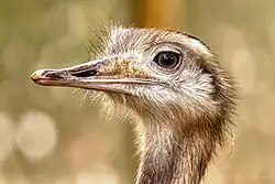 The rhea (/ˈriːə/ REE-ə), also known as the ñandú[a] (/njænˈduː/ nyan-DOO) or South American ostrich,[3][4] is a South American ratite (flightless bird without a keel on the sternum bone) of the order Rheiformes. Rheas are distantly related to the two African ostriches and Australia's emu (the largest, second-largest and third-largest living ratites, respectively), with rheas placing just behind the emu in height and overall size.