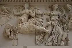 In an obscure version, attested only on the east frieze of a temple at Lagina, the goddess of crossroads Hecate assisted Rhea in saving Zeus from his father. The frieze shows Hecate presenting to Cronus the swaddled stone while the real infant is being whisked away in safety.[24][25]