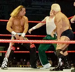 On September 22 at Unforgiven, Triple H defended the World Heavyweight Championship against Rob Van Dam. During the match, Flair came down to the ring and grabbed the sledgehammer from Triple H and teased hitting him before hitting Van Dam, allowing Triple H to get the win, turning him heel in the process and accompanied Triple H to the ring as his manager.[73] Shortly after, Batista moved from SmackDown! to Raw and Flair also began accompanying him to the ring while continuing to second Triple H.[74] On June 15, 2003 at Bad Blood, Flair was able to defeat Shawn Michaels after Randy Orton struck Michaels with a chair.[75][76]