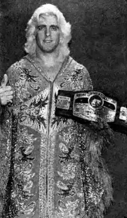 On September 17, 1981, Flair beat Dusty Rhodes for his first NWA World Heavyweight Championship.[1] In the following years, Flair established himself as the promotion's main franchise in the midst of emerging competition from Vince McMahon's World Wrestling Federation (WWF). An unsanctioned title loss took place on January 6, 1983, to Carlos Colón Sr. in Puerto Rico.[12] Flair recovered the championship belt in a phantom change seventeen days later not officially recognized by the NWA. Harley Race won the NWA World Heavyweight Championship from Flair in 1983, but Flair regained the title at Starrcade in a steel cage match.[1] Officially, Flair won the NWA World Heavyweight Championship eight more times. Flair lost the title to Race and won it back in the span of three days in New Zealand and Singapore in March 1984. At the 1st David Von Erich Memorial Parade of Champions at Texas Stadium, Flair was pinned by Kerry Von Erich, but he regained the title eighteen days later in Japan[29] and reigned for two years, two months and two days, losing the title to Dusty Rhodes on July 26, 1986, at The Great American Bash in a Steel Cage Match.[30] However, Flair regained the title at a house show on August 9, when Rhodes passed out in the Figure Four leglock.[31]