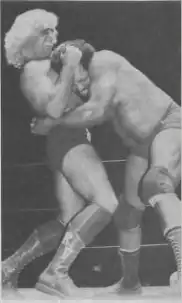 A successful amateur wrestler in his teens, Flair trained as a professional wrestler with Verne Gagne.[4] He attended Gagne's first wrestling camp with Greg Gagne, "Jumpin'" Jim Brunzell, The Iron Sheik and Ken Patera at Gagne's barn outside Minneapolis in the winter of 1971. On December 10, 1972, he made his debut in Rice Lake, Wisconsin, battling George "Scrap Iron" Gadaski to a 10-minute draw while adopting the ring name Ric Flair.[4][5] During his time in the American Wrestling Association (AWA), Flair had matches with Dusty Rhodes, Chris Taylor, André the Giant, Larry Hennig and Wahoo McDaniel.[23][24]