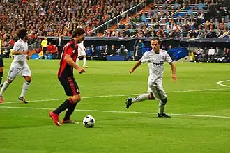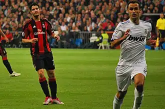 On 10 August 2010, Real Madrid signed Carvalho for a reported fee of €7.9 (£6.7) million on a two-year contract.[62] He made his debut on 13 August 2010 in a friendly match against Bayern Munich, which Real Madrid won 4–2 on penalties after a 0–0 draw.[63] His La Liga debut came on 29 August, in a 0–0 draw against Mallorca,[64] and, in the following match, against Osasuna, he scored his first Liga goal; Mesut Özil raced to the penalty area and managed to thread a low cross for Cristiano Ronaldo, whose first time shot was blocked by the Osasuna's goalkeeper Ricardo, but the Portuguese managed to tip-toe the rebound for Carvalho to score the go-ahead goal, giving his team a 1–0 home victory.[65] On 19 October 2010, in a UEFA Champions League victory against Milan, Carvalho was named the Man of the match by the Spanish newspaper Marca.[66] Some weeks later, on 7 November, Carvalho proved again to be in good shape in a 2–0 derby victory against Atlético Madrid, where he scored his second goal in La Liga, being named again the man of the match.[67] Next month on day 19, in a 1–0 home victory against Sevilla, Carvalho received his first red card for the club; having already been booked in the first half, he was shown a second yellow following an aerial challenge with Sevilla's Álvaro Negredo in the second half.[68] On 19 February 2011, he scored his third and last season goal against Levante in another 2–0 league victory.[69] Carvalho made 48 appearances in all competitions that season, bringing calmness and solidness to the defence, and was a heavy reason why Real Madrid had the best defense in Champions League, only letting five goals get past their goalkeeper.