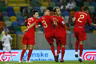 Carvalho represented Portugal at the 2006 World Cup in Germany, finishing fourth overall. During the quarter-final game against England, referee Horacio Elizondo adjudged Wayne Rooney to have trodden on Carvalho's groin, right in front of him, and the English player was sent off for violent conduct.[85] The English media, however, speculated that teammate Cristiano Ronaldo had influenced Elizondo's decision by aggressively complaining, after which he was seen in replays winking at the Portuguese bench following Rooney’s dismissal.[86] In the following semi-final game against France in Munich on 5 July 2006, Carvalho was whistled for a foul against France's Thierry Henry in the penalty area, resulting in a penalty kick. Zinedine Zidane converted the spot kick to give France a 1–0 win over Portugal.[87] Also in the same game, Carvalho was booked with his second yellow card of the knockout phase, and was forced to miss the third place game against hosts Germany on 8 July in Stuttgart, which ended in a 3–1 defeat.[88] He in played each of his team's other preceding matches throughout the World Cup, as a member of Portugal's central defensive pairing in the team's starting lineup alongside Fernando Meira, and as a result of his performances, he was one of the 23 players nominated for the All Star Team of the tournament.[89][90]