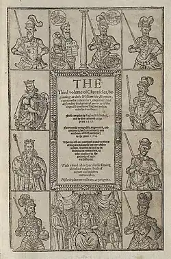 The Chroniques of Jean Froissart, a fourteenth-century account of the Hundred Years' War translated into English by John Bouchier in c. 1524, includes a sympathetic account of the deposition of King Richard. It is likely that this was one of Shakespeare's sources for the play.[2] Shakespeare's primary source for Richard II, as for most of his chronicle histories, was Raphael Holinshed's Chronicles of England, Scotlande, and Irelande; the publication of the second edition in 1587 provides a terminus post quem for the play.[3] Edward Hall's The Union of the Two Illustrious Families of Lancaster and York appears also to have been consulted,[4] and scholars have also supposed Shakespeare familiar with Samuel Daniel's poem on the civil wars.[5]