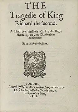 The earliest recorded performance of Richard II was a private one, in Canon Row, the house of Edward Hoby, on 9 December 1595.[8] The play was entered into the Register of the Stationers Company on 29 August 1597 by the bookseller Andrew Wise; he published the first quarto later that year, printed by Valentine Simmes. The second and third quartos followed in 1598—the only time a Shakespeare play was printed in three editions in two years. Q4 followed in 1608 and Q5 in 1615. The play was next published in the First Folio in 1623.