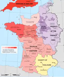 The Angevin domains (in various shades of red) on the continent, which Richard eventually inherited from his parents