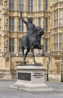 On this campaign, Richard acquired the name "the Lion" or "the Lionheart" due to his noble, brave and fierce leadership.[49][47] He is referred to as "this our lion" (hic leo noster) as early as 1187 in the Topographia Hibernica of Giraldus Cambrensis,[50] while the byname "lionheart" (le quor de lion) is first recorded in Ambroise's L'Estoire de la Guerre Sainte in the context of the Accon campaign of 1191.[51]