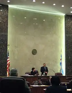 Daley defeated Sawyer in the primary.[55] In the 1989 general election, Daley faced Republican candidate Edward Vrdolyak, a former Democratic alderman who had opposed Mayor Washington, and Alderman Timothy C. Evans, the candidate of the newly created Harold Washington Party. Daley won the general election on April 4, 1989.[56][57] Daley was inaugurated as Mayor of Chicago on April 24, 1989,[58][59][60] his 47th birthday, at a ceremony in Orchestra Hall.