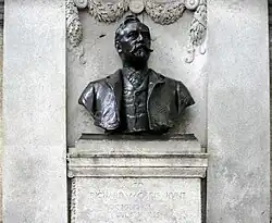 Hunt died at Newport, Rhode Island in 1895, and was buried at Newport's Common Burying Ground and Island Cemetery. In 1898, the Municipal Art Society commissioned the Richard Morris Hunt Memorial, designed by the architect Bruce Price, with a bust of Hunt and two caryatids (one representing art, the other architecture) sculpted by Daniel Chester French.[33] The memorial was installed in the wall of Central Park along Fifth Avenue near 70th Street, across the avenue from Hunt's Lenox Library, which has since been replaced by the Frick Collection.