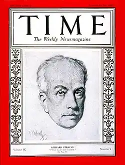 Strauss's seeming relationship with the Nazis in the 1930s attracted criticism from some noted musicians, including Toscanini, who in 1933 had said, "To Strauss the composer I take off my hat; to Strauss the man I put it back on again", when Strauss had accepted the presidency of the Reichsmusikkammer.[21] Much of Strauss's motivation in his conduct during the Third Reich was, however, to protect his Jewish daughter-in-law Alice and his Jewish grandchildren from persecution. Both of his grandsons were bullied at school, but Strauss used his considerable influence to prevent the boys or their mother being sent to concentration camps.[22]