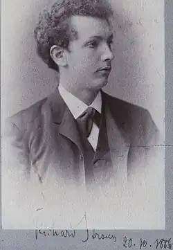 A child prodigy in composition, Strauss began his musical studies at the age of four, studying piano with August Tombo who was the harpist in the Munich Court Orchestra.[1] Soon after, he began attending the rehearsals of the orchestra, and began getting lessons in music theory and orchestration from the ensemble's assistant conductor. He wrote his first composition at the age of six, and continued to write music almost until his death. In 1872, he started receiving violin instruction from Benno Walter, the director of the Munich Court Orchestra and his father's cousin, and at 11 began five years of compositional study with Friedrich Wilhelm Meyer.[1] In 1882 he graduated from the Ludwigsgymnasium and afterwards attended only one year at the University of Munich in 1882–1883.[1]