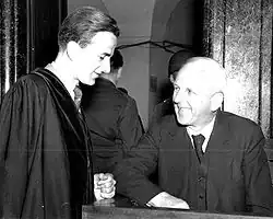 At the end of the war Weizsäcker continued his study of history in Göttingen and went on to study law,[21] but he also attended lectures in physics and theology.[22] In 1947, when his father Ernst von Weizsäcker was a defendant in the Ministries Trial for his role in the deportation of Jews from occupied France, Richard von Weizsäcker served as his assistant defence counsel.[23][24] He took his first legal Staatsexamen in 1950, his second in 1953, and finally earned his doctorate (doctor juris) in 1955. In 1953 he married Marianne von Kretschmann. They had met when she was an 18-year-old schoolgirl and he was thirty. In 2010, Weizsäcker described the marriage as "the best and smartest decision of my life".[25] They had four children:[26] Robert Klaus von Weizsäcker, a professor of economics at the Technical University of Munich,[27] Andreas von Weizsäcker, an art professor at the Academy of Fine Arts Munich,[28] Beatrice von Weizsäcker, a lawyer and journalist,[29] and Fritz Eckhart von Weizsäcker, chief physician at the Schlosspark-Klinik in Berlin.[30][31] In the late 1970s, his son Andreas was a student at the Odenwaldschule. When reports about sexual abuse there surfaced in 2010, it was speculated in the media that Andreas might have been one of the victims, but this was denied by the family.[32] Andreas died of cancer in June 2008, aged 51.[28] Weizsäcker's son Fritz was murdered by a man armed with a knife on 19 November 2019, while holding a lecture at the Schlosspark-Klinik in Berlin, where he worked.[33][34]