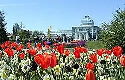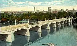 Another important contributor to Richmond's resurgence was the Richmond Union Passenger Railway, a trolley system developed by electric power pioneer Frank J. Sprague. The system opened its first Richmond line in 1888, using an overhead wire and a trolley pole to connect to the current and electric motors on the car's trucks.[43] The success led to electric streetcar lines rapidly spreading to other cities.[44] A post-World War II transition to buses from streetcars began in May 1947 and was completed on November 25, 1949.[45]