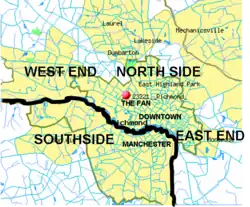 Richmond's Northside is home to numerous listed historic districts.[64] Neighborhoods such as Chestnut Hill-Plateau and Barton Heights began to be developed at the end of the 19th century when the new streetcar system made it possible for people to live on the city's outskirts and commute downtown. Other prominent Northside neighborhoods include Azalea, Barton Heights, Bellevue, Chamberlayne, Ginter Park, Highland Park, and Rosedale.[63]