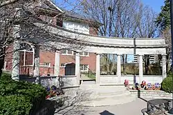 The Richmond Hill Dynes Jewellers softball team was the 1972 Softball World Champions.[7] The Royal Canadian Air Farce was recorded at the Curtain Club Theatre in Richmond Hill for its first 5 seasons on radio, beginning in 1973.[8] The Air Farce returned for an anniversary recording in the 1990s. Also in 1973 was the centennial of the town's incorporation as a village, and the town set up a number of celebratory activities, including a beard growing contest, commissioning a centennial song, a parade, a street dance and the unveiling of a historic plaque honouring the town's founding in front of the municipal offices. June 27 was officially declared Russell Lynett Day, named after the town's clerk, only the third in its existence. 1973 also saw the sale of the last of the original rose-growing greenhouses in Richmond Hill. Development had led to increasing property taxes and the H.J. Mills greenhouses relocated to Bayview Avenue and Elgin Mill Road. The site of the greenhouses was developed as a subdivision. The fast-growing town set aside significant areas for parks, with five new parks dedicated in 1973, and two more in 1974. The Richmond Hill Historical Society was founded in 1973.[7] The society was dedicated to preserving the history of Richmond Hill and raising awareness of the town's history. Their first action was to restore a 150-year-old house, known as the Burr House.