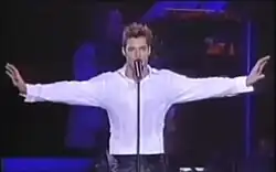 To promote Vuelve, Martin embarked on the worldwide Vuelve Tour; he performed in Asia, Australia, Europe, Mexico, South America, and the United States.[57][58] Although Latin music was not important to the Recording Academy or the mainstream music industry at the time, Tommy Mottola, then-chief of Columbia Records, was certain about Martin's stardom and pushed hard to have him on the Grammy Awards ceremony. Finally, on February 24, 1999, cavorting with a 15-piece band alongside and a large number of dancers and percussionists, Martin performed a bilingual version of "La Copa de La Vida" at the 41st Annual Grammy Awards, which was greeted with a standing ovation and met with acclaim from music critics.[56][59] At the same night, Vuelve earned Martin his first Grammy award, for Best Latin Pop Performance.[60]