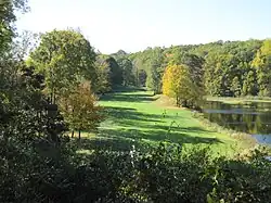 Ridgefield consists of hilly, rocky terrain, ranging from 1,060 feet (320 m) above sea level (at Pine Mountain) to 342 feet (104 m) at Branchville. Its average village elevation is 725 feet (221 m) above sea level.[7] The landscape is strewn with countless rocks deposited by glaciers, and among the town's bodies of water is Round Pond, formed in a kettle left by the last glacier 20,000 years ago. Another interesting body of water in the town is Mamanasco Lake, an 86-acre (35 ha) lake near Ridgefield High School. A particularly interesting feature is Cameron's Line, named for Eugene N. Cameron, who discovered that rocks west of the line differed greatly from those east of it. This fault line was formed some 250 million years ago by the collision of "Proto North America" and "Proto Africa", and there are still occasional light earthquakes felt along its length. The line bisects the southern half of the town, running generally north of West Lane, across the north end of the village, past the south end of Great Swamp and generally easterly into Redding in the Topstone area.[8] North of Cameron's Line, the town is rich in limestone. The mineral was extensively mined, and remnants of several limekilns exist today. Also mined here in the 19th century was mica, pegmatite, and quartz. Gold, as well as gemstones such as garnet and beryl, have been found here, and dozens of minerals have been unearthed at the old Branchville Mica Quarry. Uraninite, a source of uranium, is found here, too.