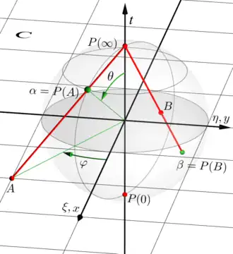 Stereographic projection of a complex number A onto a point α of the Riemann sphere.