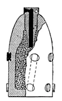 Cannonball equipped with winglets inside the bore of a rifled cannon c. 1860