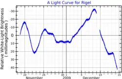 Rigel has been known to vary in brightness since at least 1930. The small amplitude of Rigel's brightness variation requires photoelectric or CCD photometry to be reliably detected. This brightness variation has no obvious period. Observations over 18 nights in 1984 showed variations at red, blue, and yellow wavelengths of up to 0.13 magnitudes on timescales of a few hours to several days, but again no clear period. Rigel's color index varies slightly, but this is not significantly correlated with its brightness variations.[47]