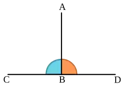 Right angles are fundamental in Euclid's Elements. They are defined in Book 1, definition 10, which also defines perpendicular lines. Definition 10 does not use numerical degree measurements but rather touches at the very heart of what a right angle is, namely two straight lines intersecting to form two equal and adjacent angles.[7] The straight lines which form right angles are called perpendicular.[8] Euclid uses right angles in definitions 11 and 12 to define acute angles (those smaller than a right angle) and obtuse angles (those greater than a right angle).[9] Two angles are called complementary if their sum is a right angle.[10]