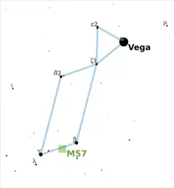M57 is found south of the bright star Vega, which forms the northwestern vertex of the Summer Triangle asterism. The nebula lies about 40% of the distance from Beta (β) to Gamma (γ) Lyrae, making it an easy target for amateur astronomers to find.[13]
