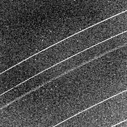 The Voyager 2 spacecraft observed a strange signal from the ε ring during the radio occultation experiment.[26] The signal looked like a strong enhancement of the forward-scattering at the wavelength 3.6 cm near ring's apoapsis. Such strong scattering requires the existence of a coherent structure. That the ε ring does have such a fine structure has been confirmed by many occultation observations.[18] The ε ring seems to consist of a number of narrow and optically dense ringlets, some of which may have incomplete arcs.[18]