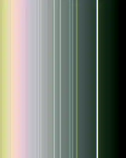 The γ ring is narrow, optically dense and slightly eccentric. Its orbital inclination is almost zero.[24] The width of the ring varies in the range 3.6–4.7 km, although equivalent optical depth is constant at 3.3 km.[25] The normal optical depth of the γ ring is 0.7–0.9. During a ring plane-crossing event in 2007 the γ ring disappeared, which means it is geometrically thin like the ε ring[18] and devoid of dust.[19] The width and normal optical depth of the γ ring show significant azimuthal variations.[18] The mechanism of confinement of such a narrow ring is not known, but it has been noticed that the sharp inner edge of the γ ring is in a 6:5 resonance with Ophelia.[30][32]