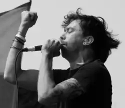 During the early part of its career, Rise Against's music was characterized by a gritty sound described by critics as both hardcore punk and melodic hardcore.[166][167] The Unraveling accentuated a raw punk sound, while Revolutions per Minute featured an overall darker tone.[168] According to Principe: "The Unraveling was more of us just trying to figure out how we functioned as a band and what type of band we wanted to be. It all just came together with [Revolutions per Minute], my songwriting style and Tim's, it really meshes well together and I think it shows on that record.[17] Although this darker tone carried into Siren Song of the Counter Culture, McIlrath specially mentioned that The Sufferer & the Witness was an attempt to return to Rise Against's punk roots.[169] Corey Apar of AllMusic wrote "[The Sufferer & the Witness] is basically one shout-along, mosh-worthy song after another".[42] In early Rise Against songs, McIlrath would often shift between clean vocals and screaming vocals.[170][b]