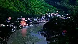 Rishikesh or Hrishikesh is a municipal corporation and tehsil of Dehradun district of the Indian state Uttarakhand. It is situated on the right bank of the Ganges river and is a pilgrimage town for Hindus, with ancient sages and saints meditating there in search of higher knowledge.[4][5] There are numerous temples and ashrams built along the banks of the river.[6]