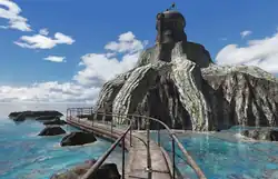 Riven has more complex and numerous puzzles than its forerunner and is set in a larger virtual world for players to explore.[11] Whereas in Myst the objective of the game is to travel to different Ages to solve puzzles before returning to a "hub Age", Riven's gameplay takes place on the five islands of the Age of Riven. Much of it consists of solving puzzles to access new areas of the islands, though players are also able to explore without fulfilling objectives.[10] The volcanic landscape depicted, with its steep cliffs and crater lakes, is bestrewn with mechanical, Victorian-style artifacts such as elevators, pipes, levers and roller coaster-like transports.[10][11] To solve the game, players must consider the purpose and physical principles of these artifacts as well as their role in the fictional culture.[11]