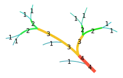 A diagram of a possible river with the Strahler number of each tributary labeled.