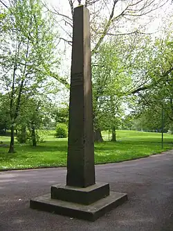 The lower reaches of the Irwell have flooded many times in its history, the most well documented being the floods of 1866,[33] 1946, 1954, 1980, 2007, 2015 and 2020. In December 1816 rapidly thawing snow caused the river to flood, sweeping away a considerable amount of property including building materials and livestock. Locals reported the height of the river to have been almost as great as a more serious flood of 1768. A local public house, the Black Boy, suffered extensive damage as the water caused the rear wall to collapse, a local brewery was flooded with the loss of all its stock, and a Mersey Flat came free of its moorings, hitting Regent Bridge.[86] In 1866, the "year of the great Flood", rain fell for three continuous days commencing on Tuesday 13 November.[33] By the end of the first day, the river had risen 14 feet (4.3 metres) above normal at Peel Park, street lamps could not be lit and mills were brought to a stop. In all, £1 million of property was damaged, 450 hectares of land was flooded, 700 people had to be rescued from wrecked homes, but only one man died by drowning.[33] The height of the flood was marked by an obelisk erected in Peel Park.[33] The construction of the ship canal is said to have reduced the risk of flooding, by providing a larger outlet below Regent bridge.[33] In 1946 in Salford 5,300 properties were flooded, and 600 were flooded in 1954.[87]