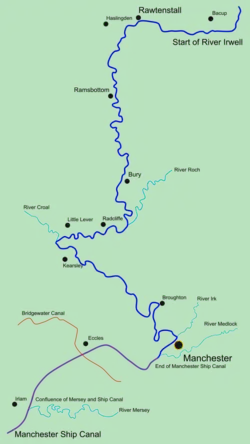 From its source to the confluence with the River Mersey the Irwell is about 39 miles (63 km) long.[1] Rising on the moors above Cliviger near the sources of the Lancashire River Calder and the Yorkshire River Calder,[2] it flows south through Bacup, Rawtenstall, Ramsbottom and Bury before merging with the River Roch near Radcliffe. Turning west, it joins the River Croal near Farnworth before turning southeast through Kearsley, Clifton and the Agecroft area of Pendlebury. It then meanders around Lower Kersal and Lower Broughton. It bisects Salford and Manchester, joining the rivers Irk and Medlock, and then turns west toward Irlam, as part of the Manchester Ship Canal. Its course ends just beyond Irlam Locks, where it empties into the Mersey near Flixton.