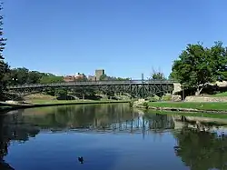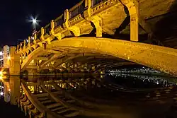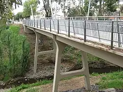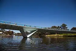 Due to the river's path through the centre of Adelaide, transport necessitated the construction of many bridges. Prior to the bridges all crossings had been via fords which proved a dangerous practice in winter and spring. The first bridge was one of timber built in 1839 approximately 500 metres (1,600 ft) west of the current City bridge, but destroyed by floods in September 1844.[55] In 1849 £6,000 was allocated to bridge the Torrens. Within four years three wooden bridges had been built and subsequently destroyed in floods.[60] The bridges listed below are from up-river to down-river.