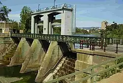 In 1867, prison labour from nearby Adelaide Gaol was used to build a wooden dam near the site of the current weir. The dam was poorly constructed and almost immediately the Torrens washed it away. Construction of a permanent concrete weir was begun in November 1880 and completed, at a cost of £7,000, in 1881. The sluice gates were closed to begin filling the 12-hectare (30-acre) Torrens Lake on 1 July 1881. At the lake's official opening on 21 July 1881 an estimated 40,000, almost the entire population of Adelaide, attended. During the 1889 flood, the weir was overwhelmed, its gates jammed, and in trying to free them the weir's designer John Langdon was crippled.[42] The weir was rebuilt from 1928 to 1929 with its footbridge relocated and the centre section replaced. The gates can now be fully raised and the river allowed to flow unimpeded.[56]